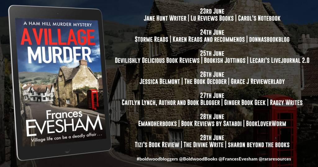 ‘A Village Murder’ by Frances Evesham is a cosy murder mystery which is reminiscent of Agatha Christie. The first book in a new series so we are introduced to a new set of characters and even a dog.