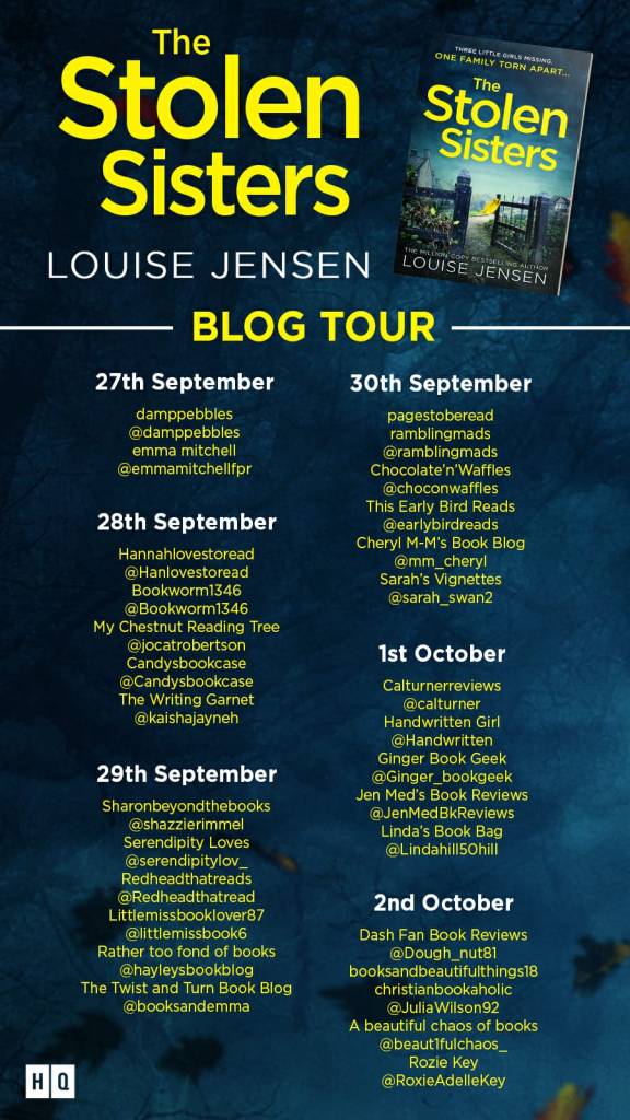‘The Stolen Sisters’ by Louise Jensen is a psychological thriller from, in my opinion, a fantastic storyteller. I am lucky enough to be allowed to take part in the tour alongside other great bloggers and I am so grateful. I was looking forward to this book and it did not disappoint at all!