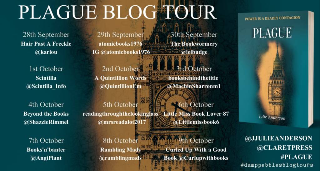 ‘Plague’ by Julie Anderson is the first instalment in a planned trilogy. It features Cassandra (Cassie), who WAS a GCHQ spook but has been demoted to a procurement position in the Civil Service. She is based in The Palace of Westminster but, oh my, is she unhappy with this position! What she doesn’t know is that an event will affect her life and it has the possibility of placing her right back to the level she thinks she deserves.