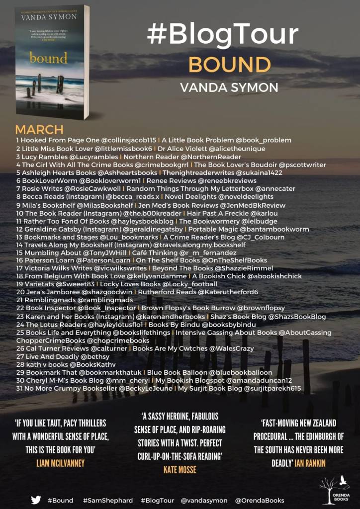 ‘Bound’ by Vanda Symon is the fourth book in the Sam Shepard series which is set in Dunedin, the second-largest city in New Zealand. Bound is described as ‘a taut, atmospheric and compelling police procedural’, well I find it so much more. I feel Vanda Symon was just warming up with the three previous books.