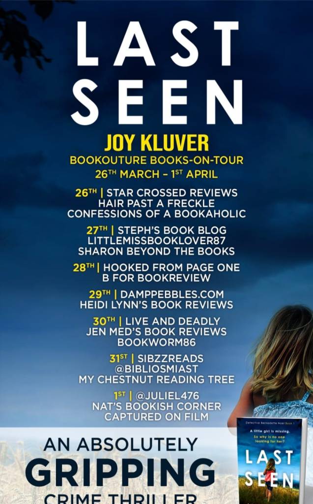 ‘Last Seen’ by Joy Kluver is her debut novel featuring Detective Bernadette ‘Bernie’ Noel. Set in Otterfield in Wiltshire She came from the Met to escape. Her relocation came with promotion after a successful conviction in London which ended in her receiving death threats. A move to the West Country was to start afresh and to protect both herself and her family. But despite her rank and her stoic exterior, Bernie is as emotional and fallible as the next person. But she cares. And that, and her tenacity, is what makes her a good detective.