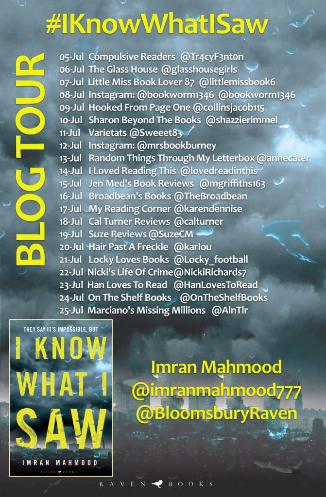 ‘I Know What I Saw’ by Imran Mahmood is his second book. I have not read his first (ok I know massive error). I have heard about it and hope to be reading it when I can. I received my book and sat down to read. My intention was a quick chapter or two, well, that never happened. Needless to say, this is a gripping thriller that had me hooked immediately.