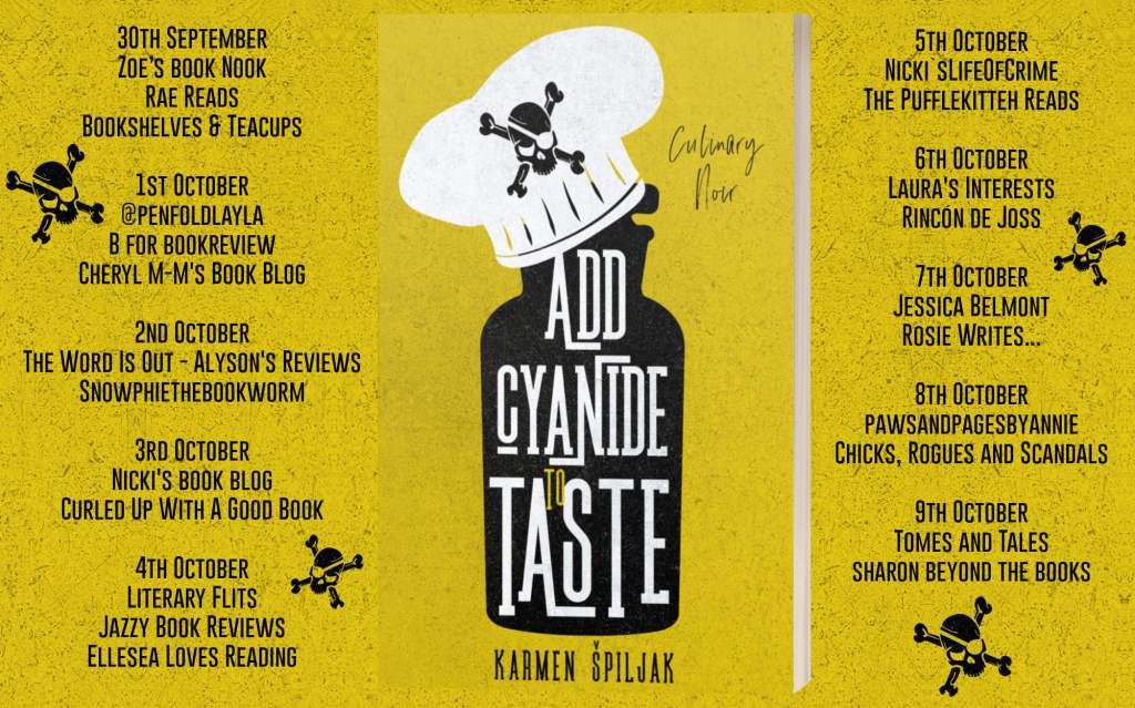 ‘Add Cyanide to Taste’ by Karmen Špiljak is a book of short stories and never mind having a new author to discover, I discovered a new genre I have never tried before..culinary noir. The stories are all based around food or any sort of eating.