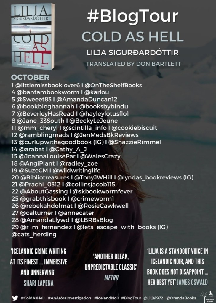 ‘Cold as Hell’ by Lilja Sigurdardóttir and translated by Quentin Bates is the first book in the Áróra Investigation series. This is an author that I was introduced to earlier this year and since then she has been one of my favourite authors for translated fiction.