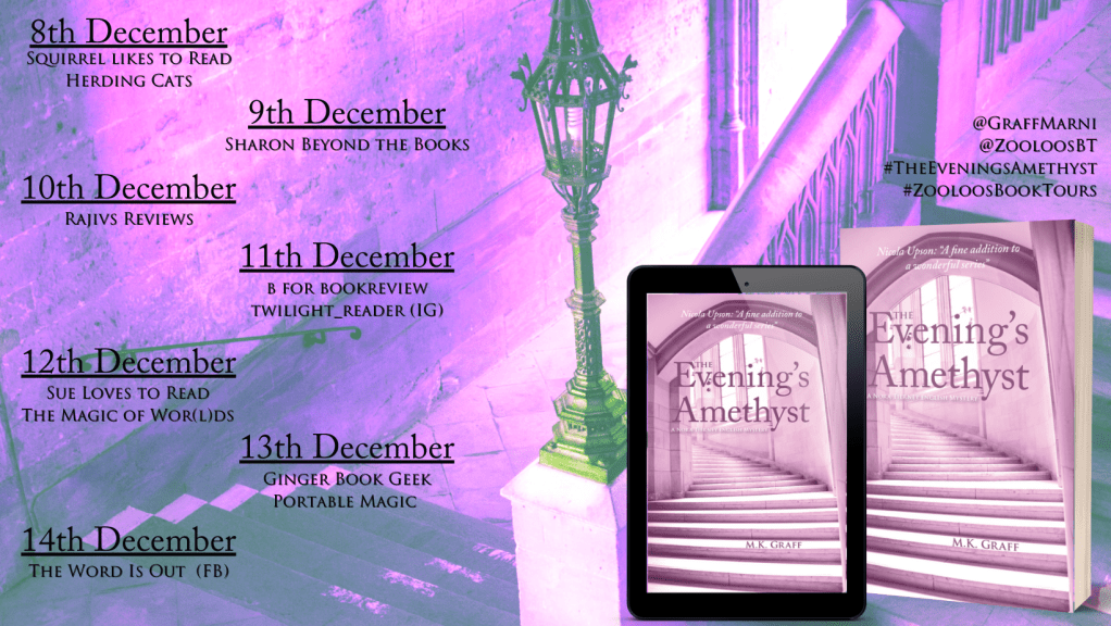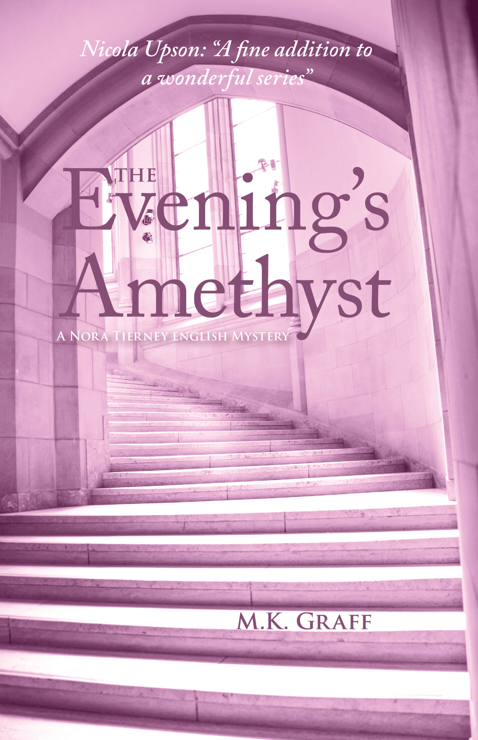 The Evening’s Amethyst by M.K Graff is the fifth book in the Nora Tierney series. I have come to this series so late! Never having read the previous books, I wondered how it would be for me. I must say I do think reading the previous books would give even more depth to this book. On the other hand, I think it is fine as a standalone novel, too. First, the synopsis.