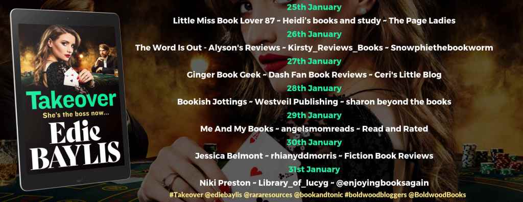 Today, I am on the tour for Edie Baylis and her new release Takeover. Thanks to Rachel’s Random Resources and Boldwood Books for my gifted copy of the book.