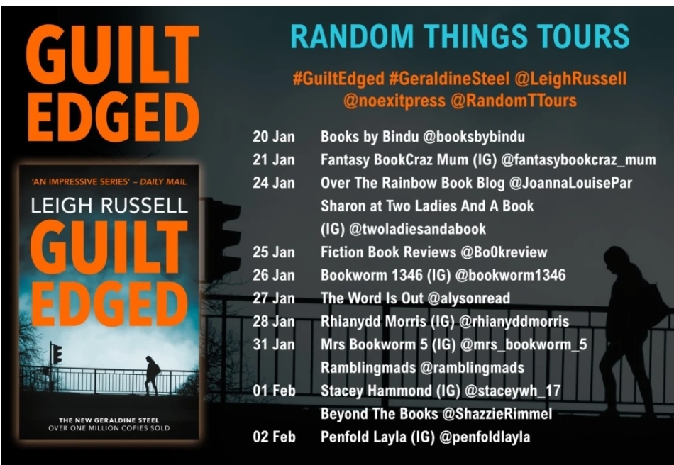 Today I am so pleased to say I am on the blog tour for Guilt Edged by Leigh Russell on behalf of Random Things Tours and I must thank Anne Cater for my invite and No Exit Press for my gifted copy.