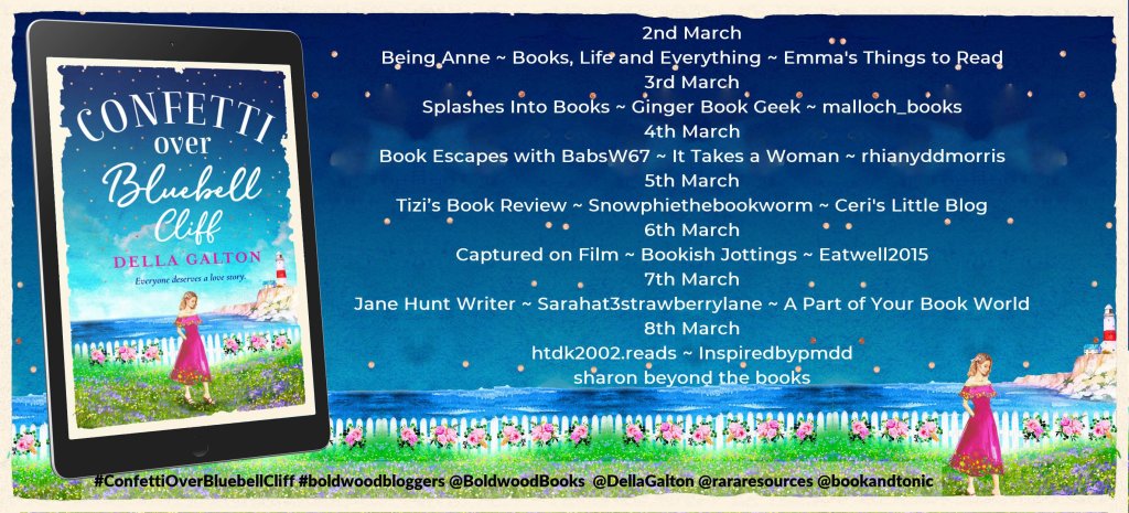 Today, it’s my post for Della Galton and Confetti Over Bluebell Cliff. Thank you to Rachel’s Random Resources and Boldwood Books for my gifted copy of the book. All opinions and thoughts are my own.