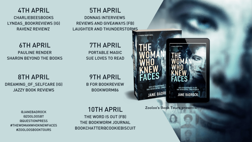 Today I’m absolutely over the moon to say Jane Badrock is back! The Woman Who Knew Faces is on the blog today. Thanks to ZooLoo’s Book Tours and Question Mark Press for the copy of this book to bring you my thoughts today.
