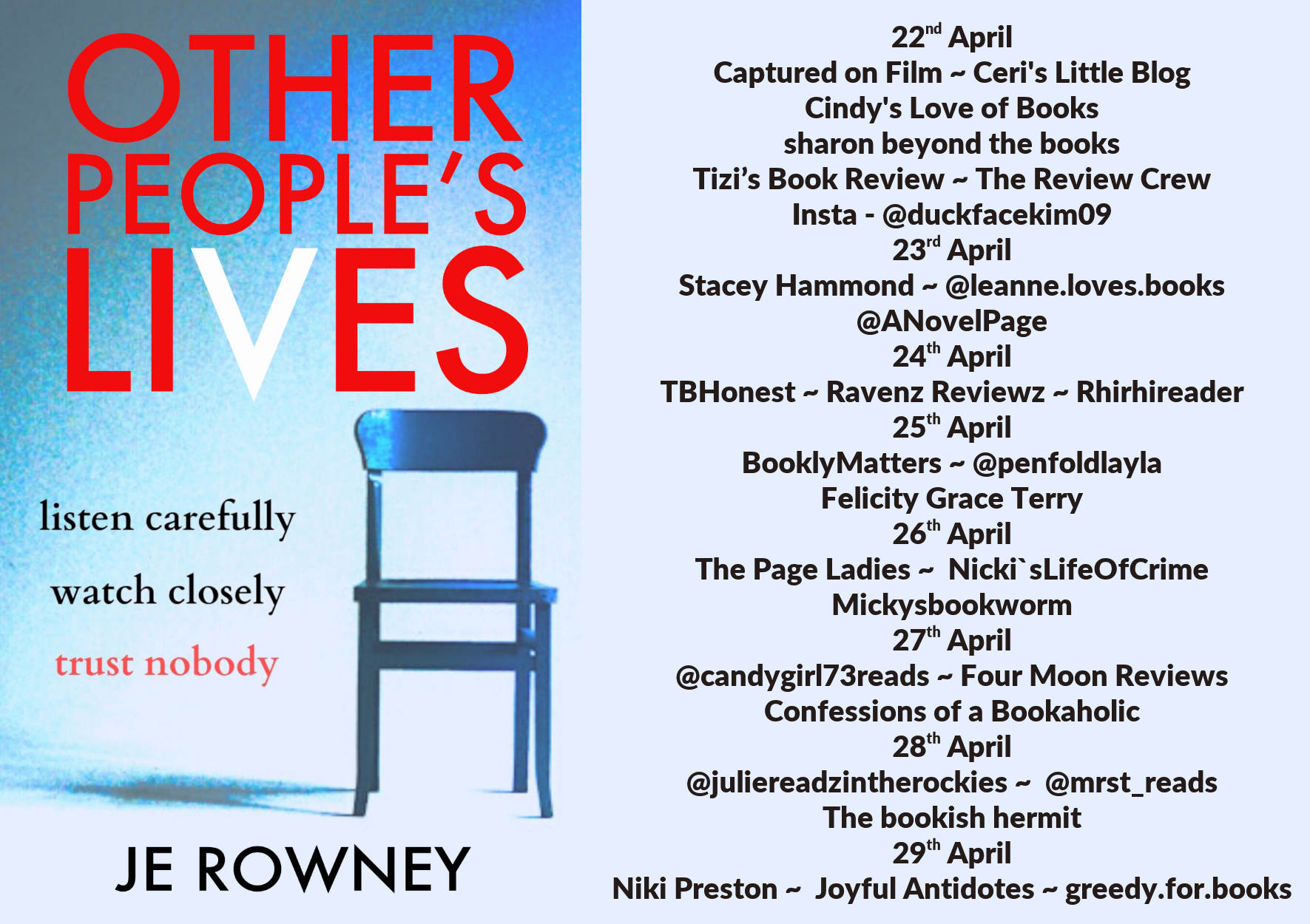 Other People’s Lives is a gripping psychological thriller from bestselling author JE Rowney.