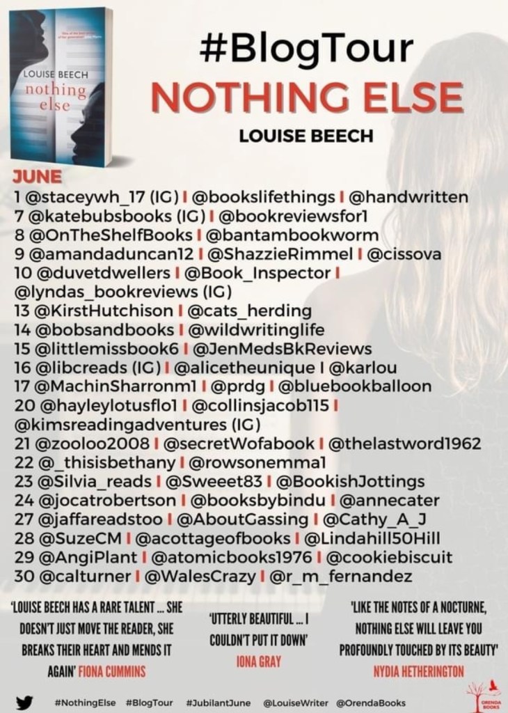 I’m am literally over the moon to be able to say I am part of the Orenda Book Tour for Louise Beech and her new book, Nothing Else. Thanks to Anne Cater and Orenda Books for the copy of the book.
