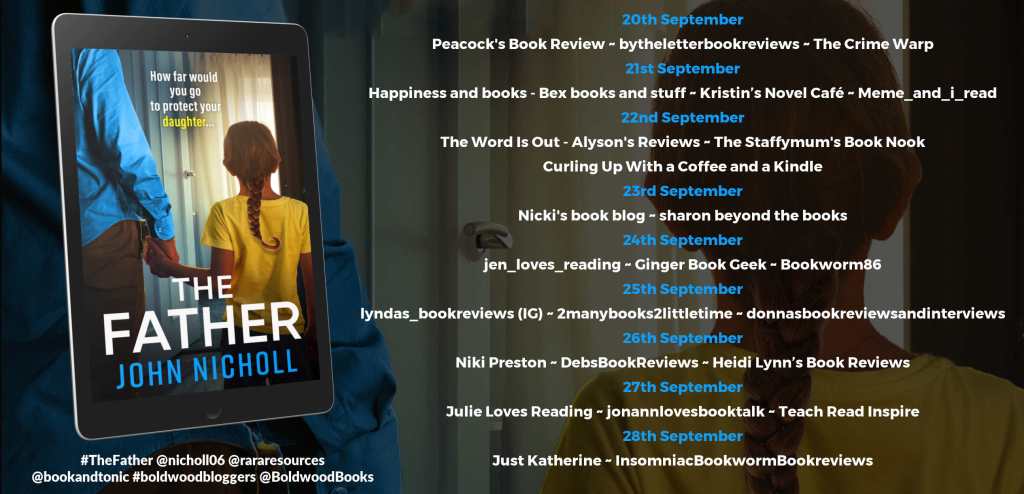 Absolutely over the moon to have The Father by John Nicholls on my blog today. Thanks to Rachel’s Random Resources, Boldwood Books and NetGalley for the copy of the book to take part in the blog tour today.