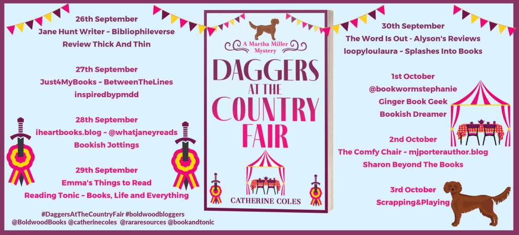 I’m happy to say today I have a stop on the Daggers At The Country Fair by Catherine Coles blog tour. Thanks to Rachel’s Random Resources, Boldwood Books and NetGalley for my inclusion on the tour and the ARC of the book to bring my honest and unbiased review.