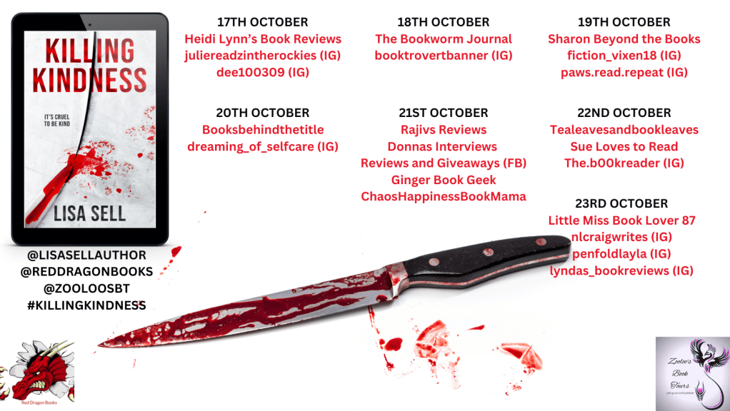Well, today I really am over the moon to be hosting a stop on the blog tour for Killing Kindness by Lisa Sell. I must thank Zoo Loo’s Book Tours, Red Dragon Publishing Limited and Lisa Sell for my ARC of the book to bring my unbiased and honest review today.