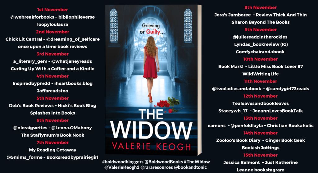 I am jumping for joy to be able to say I am part of Valerie Keogh’s new book tour, The Widow. Thanks to Rachel’s Random Resources, Boldwood Books, NetGalley and Valerie Keogh for the copy of the book.