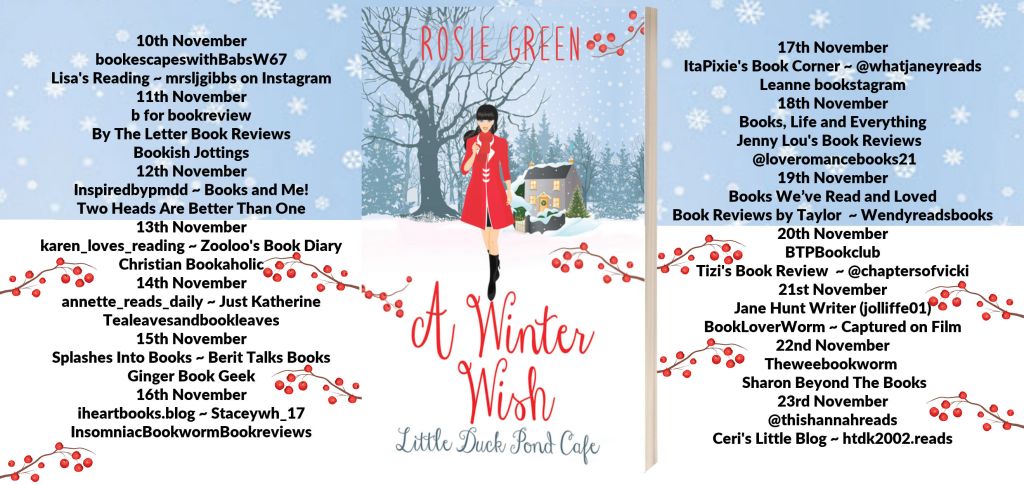 Again I begin with apologies as this tour stop is a day late. But I am happy to say I bring my review of A Winter Wish, Little Duck Pond Café by Rosie Green, to the blog today. Thank you to Rachel’s Random Resources and Rosie Green for my spot on the tour and the ARC of the book.