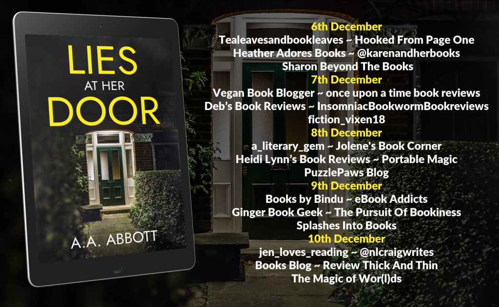 I’m so thrilled to have Lies At HerDoor by A.A. Abbott on the blog as part of Rachel’s Random Resources blog tour. Thanks to both Rachel Gilbey and A.A Abbott for my stop on the tour and the ARC of the book.