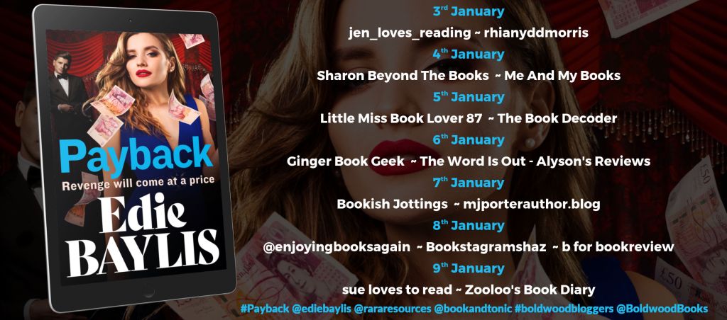 I’m please to be able to say I’m on the book tour for Payback by Edie Baylis. Thanks to Rachel’s Random Resources and Boldwood Books for my invitation and the copy of the book to join the tour.