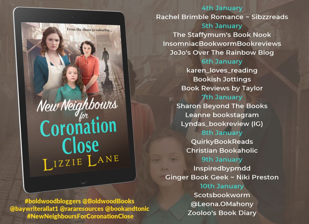 I’m back! This time it’s the turn of a historical fiction saga. New Neighbours For Coronation Close by Lizzie Lane. Tha k you to Rachel’s Random Resources and Boldwood Books for the ARC of the book to take part in the book tour.
