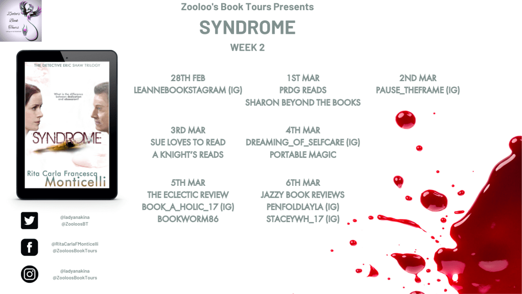 I’m jumping with joy to say it’s my turn to post my review for Syndrome by Rita Carla Francesca Monticellias part of the book tour. Many thanks to ZooLoo’s Book Tours and Rita Carla Francesca Monticelli for the gifted ebook to join in the tour.