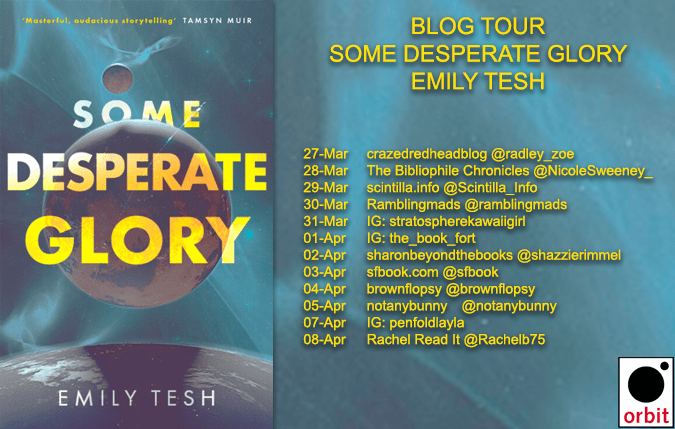 Today, I’m really happy to say I’m part of the book tour for Some Desperate Glory by Emily Tesh. Thanks to Tracy Fenton of Compulsive Readers and Orbit Books for my gifted copy in exchange for an honest and unbiased review.