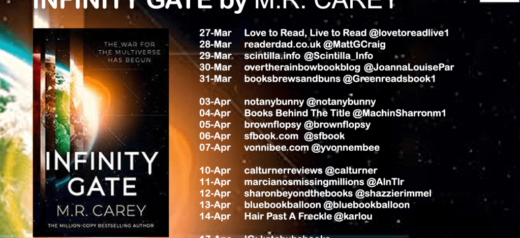 Welcome back! I’m on the book tour for Infinity Gate by M.R Carey. Thanks to Tracy Fenton and Orbit Books for the gifted physical copy of the book. From the international bestselling M. R. Carey comes a thrilling novel set in the multiverse – the tale of humanity’s expansion across millions of dimensions, and the AI technology that might see it all come to an end . . .