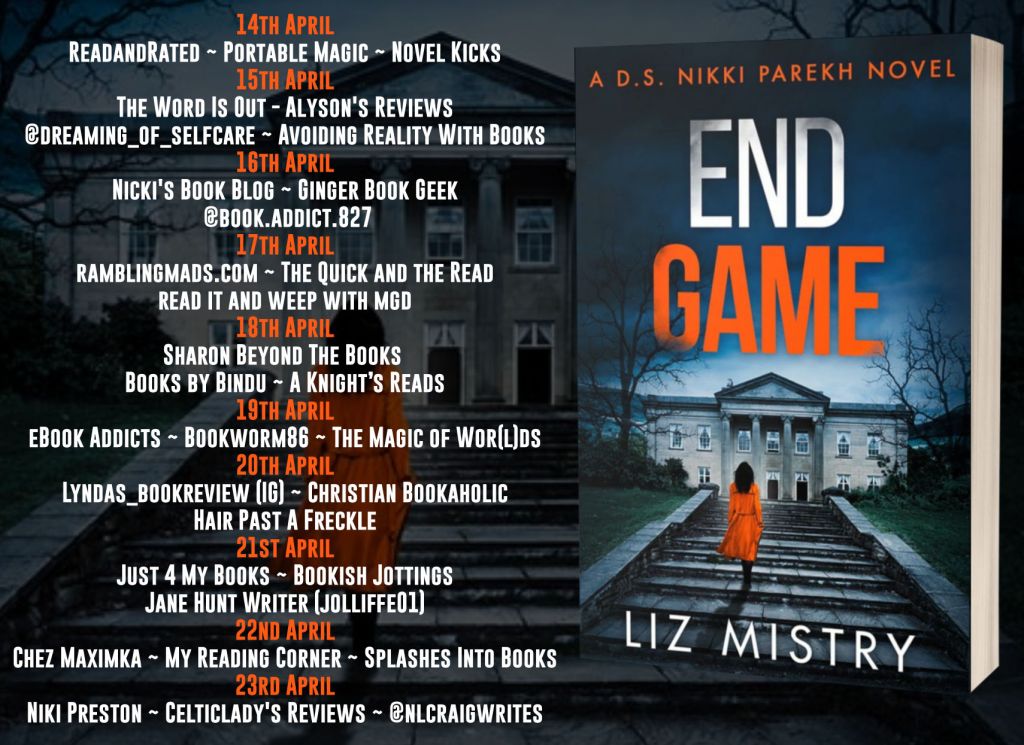 Welcome back, everyone! I am super excited to be part of the blog tour for Liz Mistry’s latest release, End Game. Thanks to Rachel’s Random Resources and Liz Mistry for both my spot on the tour and the copy of the book.