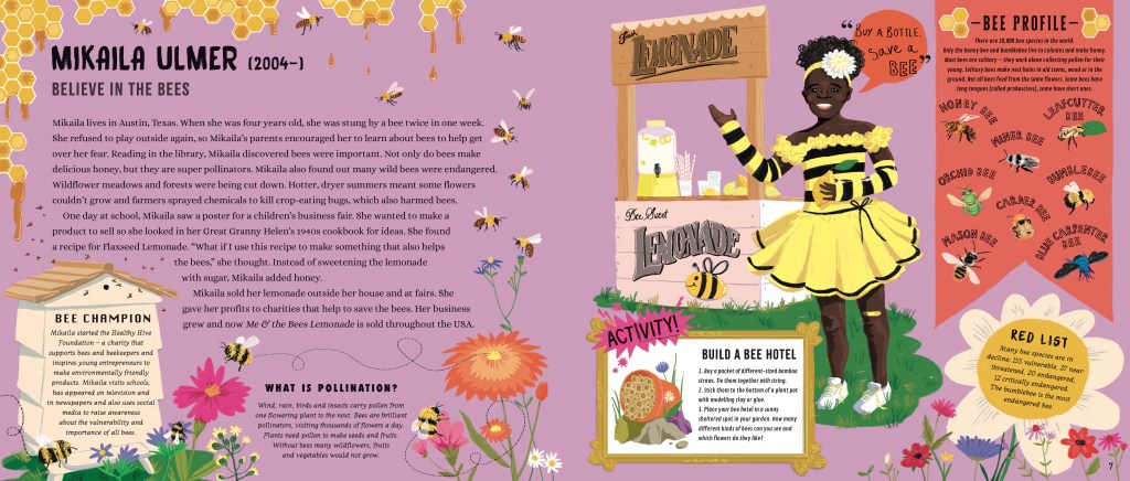 The book has had so much research poured into it. You can tell that Kate Peridot has a passion for conservation. We get to know conservationists from around the world and all the different animals they do their best to protect. Some are famous, like Sir David Attenborough, and others aren’t as well known. Mikaila Ulmer is an American who sells Me & the Bees lemonade for bees, basically.