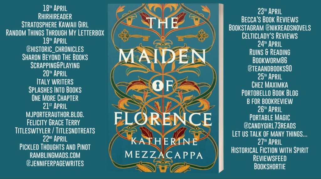 Hi all, I am posting my stop on the blog tour for The Maiden Of Florence by Kate Mezzacappa. Thanks to Rachel’s Random Resources for the gifted ebook so I could write my honest review.