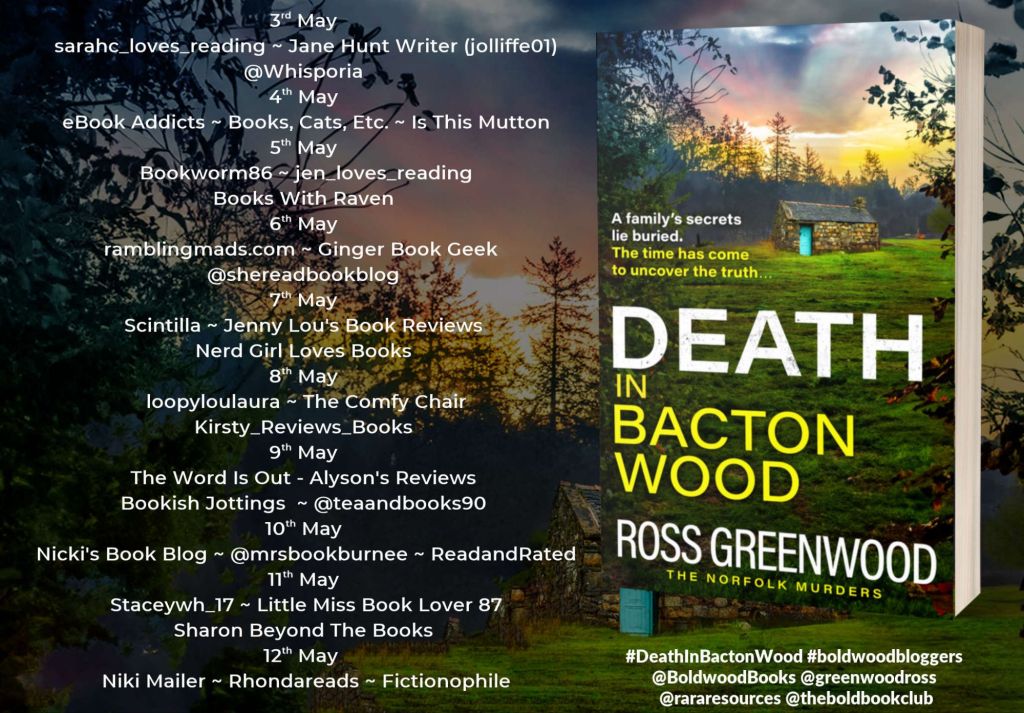 My stop on the blog tour for Death in Bacton Wood by Ross Greenwood. Thanks to Rachel’s Random Resources and Boldwood Books for the gifted ebook to write my honest review.