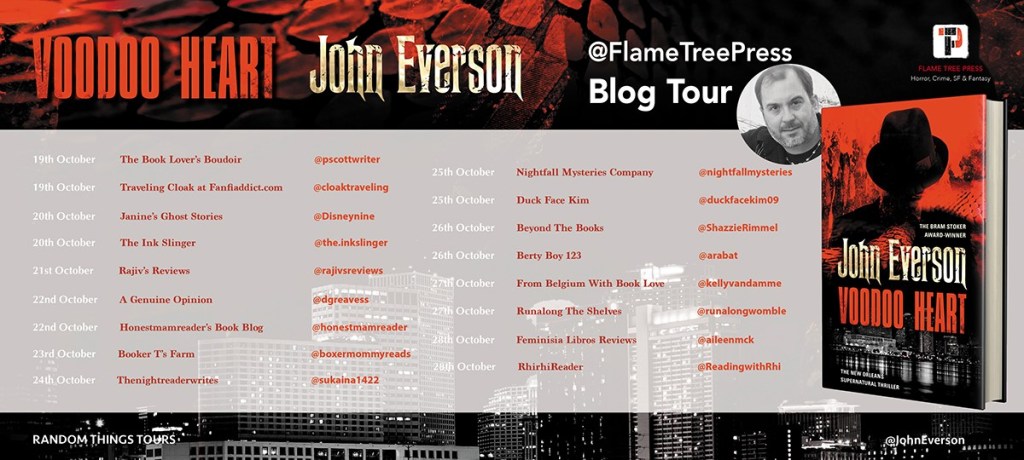 ‘Voodoo Heart’ by John Everson is an absolutely perfect read for this particular time of year. A supernatural thriller, it has all the ingredients needed to tick all of my boxes anyway. It was the cover if this marvellous book that drew me in and the fact that the publisher Flame Tree Press has given me some of my best reads of this year along with Orenda Books.