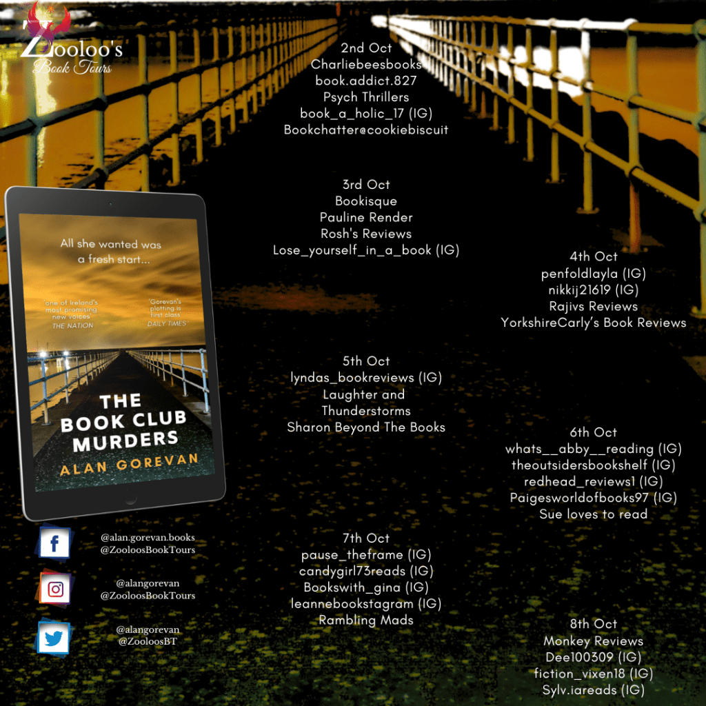 Set in Dun Laoghaire, In Ireland. We meet Lizzie, who has left her partner to live in the house she has inherited from her aunt. Her partner soon finds her but luckily, help arrives in the form of Louise, her neighbour. From there she is invited to the book club Louise and her friends run. Lizzie feels safer with her circle of friends but doesn’t realise she may have jumped from the frying pan and into the fire.